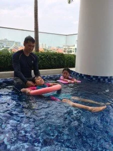 This afternoon, sisters N and YH came for their swimming lesson at Haig 162! They walk from home to the sheltered pool, and always have some time to warm up in the pool before the lesson starts.